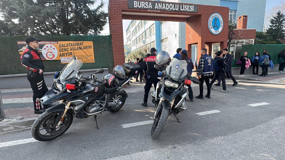Bursa İl Emniyet Müdürlüğü’ne bağlı Asayiş Şube Müdürlüğü Motosikletli Polis Timleri Büro Amirliği ekipleri ile Çocuk Şube Müdürlüğü’ne bağlı ekipler, il genelinde okul önleri ve çevrelerinde şüpheli şahıslar ve araçlara yönelik “Huzurlu Eğitim” uygulaması gerçekleştirdi.