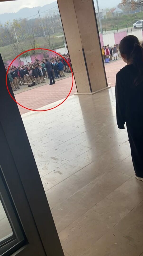 Mustafa Ç., yakasından tuttuğu öğrenciyi, ittirdi. Muhammed K., geriye doğru savrulup yere düşerken, o anlar cep telefonuyla görüntülendi.