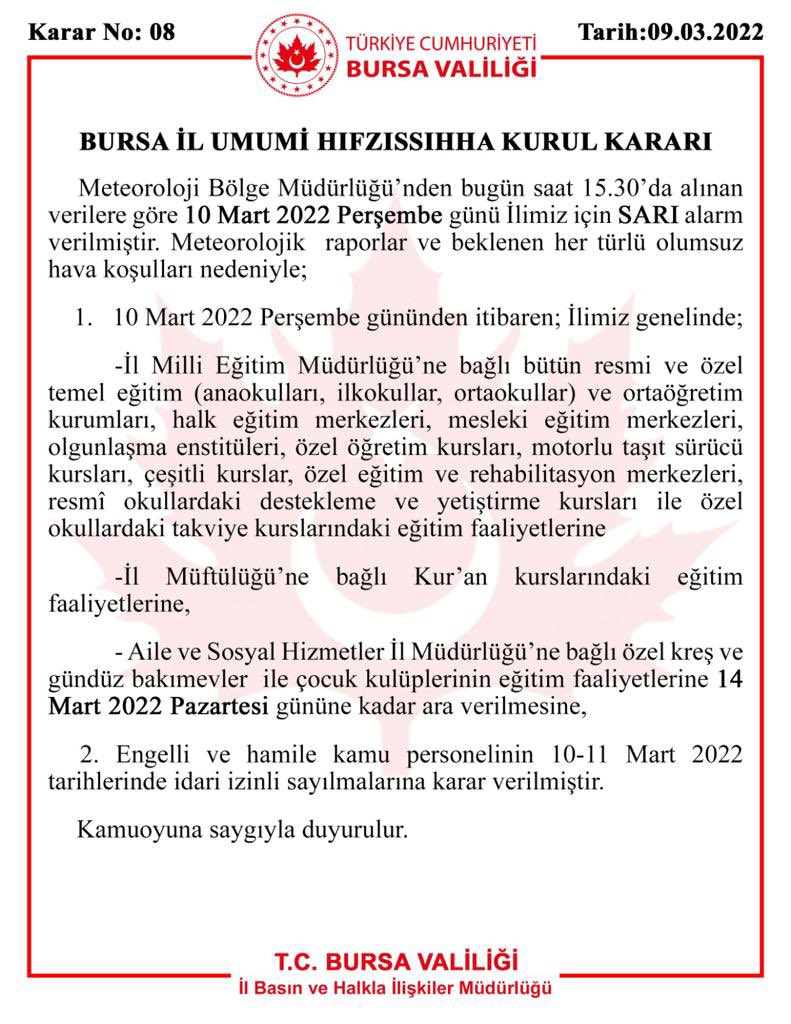 – Aile ve Sosyal Hizmetler İl Müdürlüğü’ne bağlı özel kreş ve gündüz bakımevleri ile çocuk kulüplerinin eğitim faaliyetlerine 14 Mart 2022 Pazartesi gününe kadar ara verilmesine,