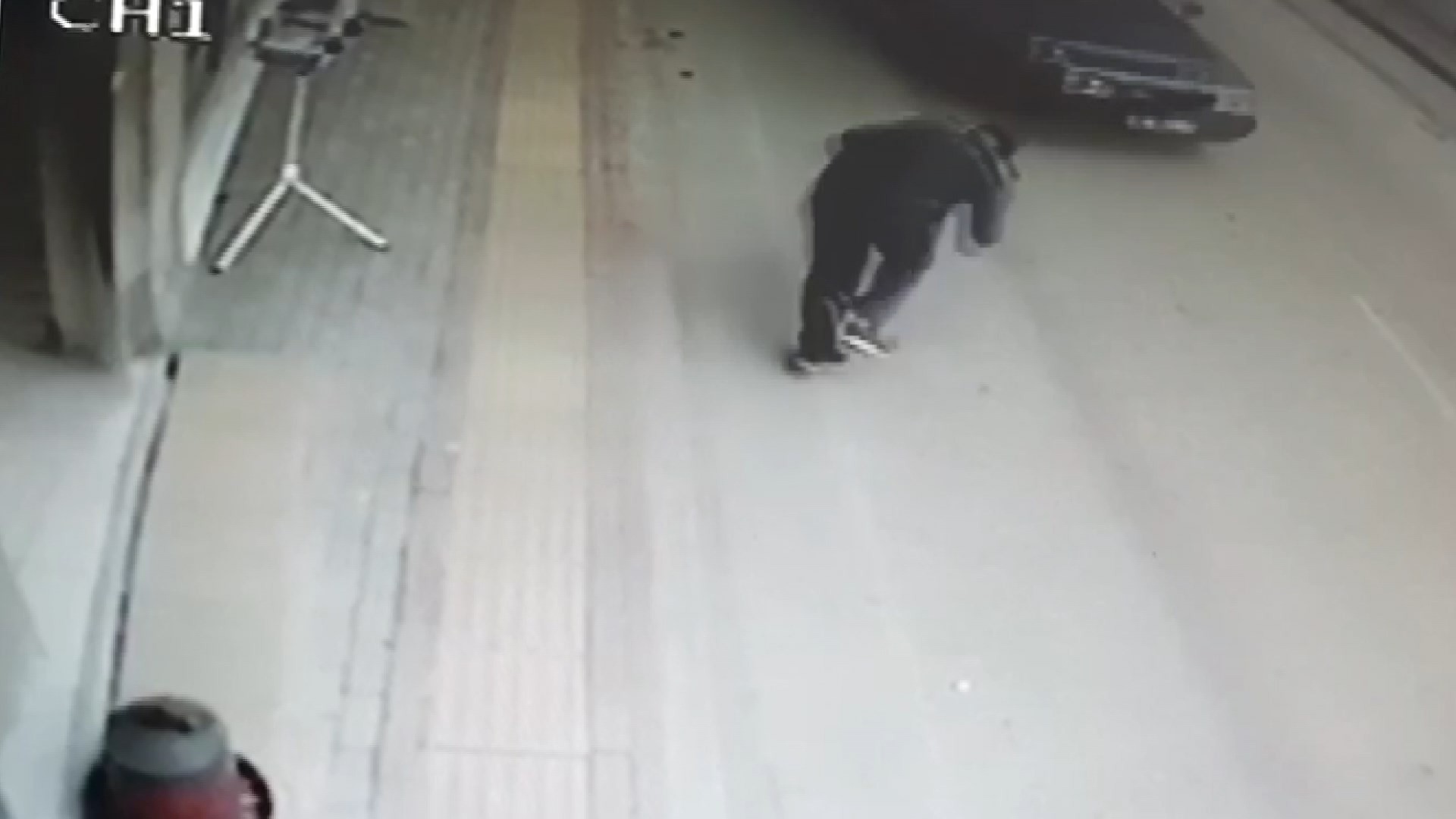 Güvenlik kamerasına yansıyan görüntülerde alışveriş yaptığı iş yerinden çıkan kişinin ayağının merdivene takılması sonucu yola savrularak gittiği sırada hızla ilerleyen otomobilin manevra yaparak yoluna devam etmesi ve düşme tehlikesi geçiren kişinin otomobilin altında kalmaktan son anda kurtulması görülüyor.