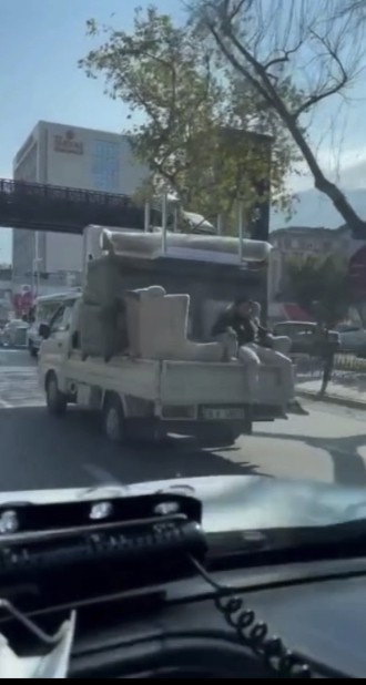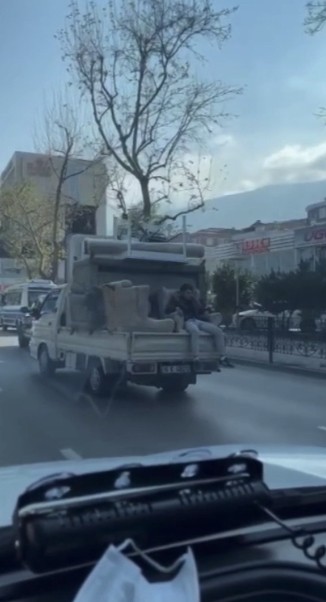Edinilen bilgiye göre, kasasında eşya yüklü bir kamyonetin arkasında koltuğa oturan vatandaş, yürekleri ağza getirdi. Muhtemel bir faciaya davetiye çıkaran vatandaşın rahatlığı “pes” dedirtti. Bu anlar ise cep telefonu kamerasına saniye saniye yansıdı.