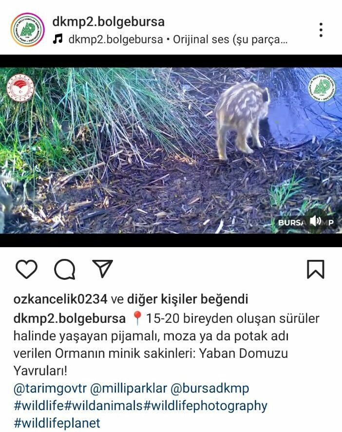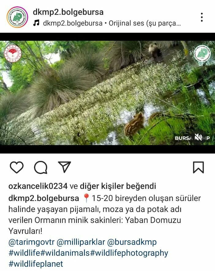Karacabey Longoz Ormanları’nda görüntülenen yaban domuzu sürüsünde yavruların fotoğrafları Doğa Koruma ve Milli Parklar Müdürlüğü’nün sosyal medya hesabından, “15-20 bireyden oluşan sürüler halinde yaşayan pijamalı, moza ya da potak adı verilen ormanın minik sakinleri: Yaban Domuzu Yavruları!” ifadeleriyle paylaşıldı.