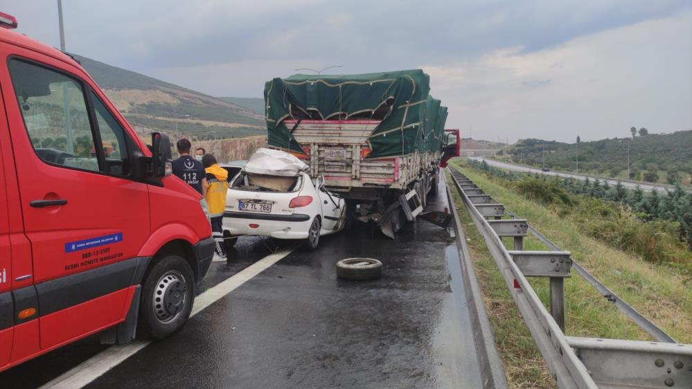 İstanbul istikametine doğru gitmekte olan Mehmet Emin Hamsan (30) idaresindeki 67 TL 766 plakalı otomobil, Gemlik kavşağını geçtikten sonra, önünde seyir halinde olan Serdar Yalçın (48) idaresindeki 10 DT 835 plakalı tomruk yüklü TIR’a arkadan çarptı.