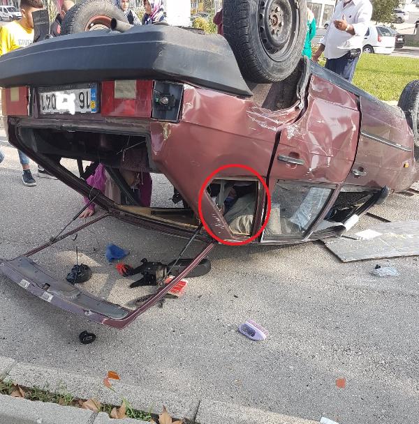 Ş.E.’nin direksiyon hakimiyetini kaybettiği 16 P 5041 plakalı otomobil, aynı yönde giden H.D. yönetimindeki 46 D 9389 plakalı otomobile çarptı. Çarpmanın etkisiyle de takla atıp, ters döndü. Sürücü Ş.E. ile beraberinde bulunan N.E., araç içinde sıkışıp, yaralandı.