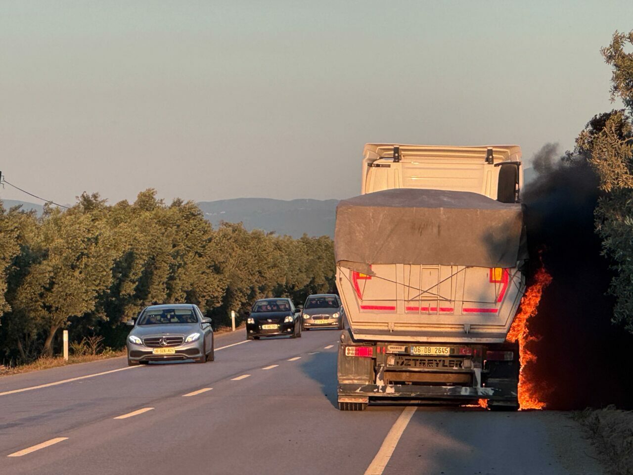 Orhangazi-İznik karayolunda seyir halinde olan 06 DB 2645 plakalı kamyonun lastikleri alev aldı.