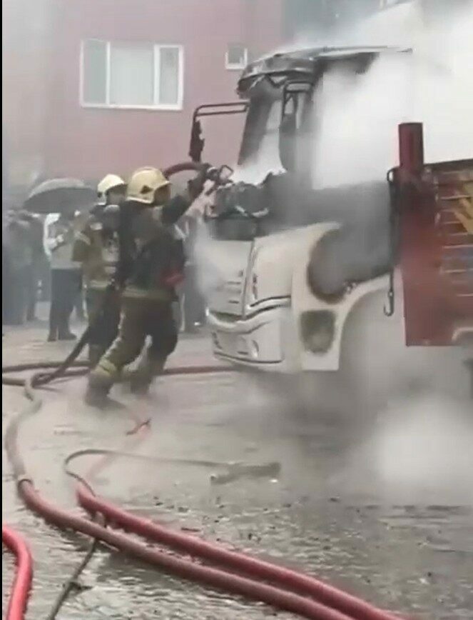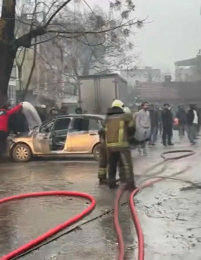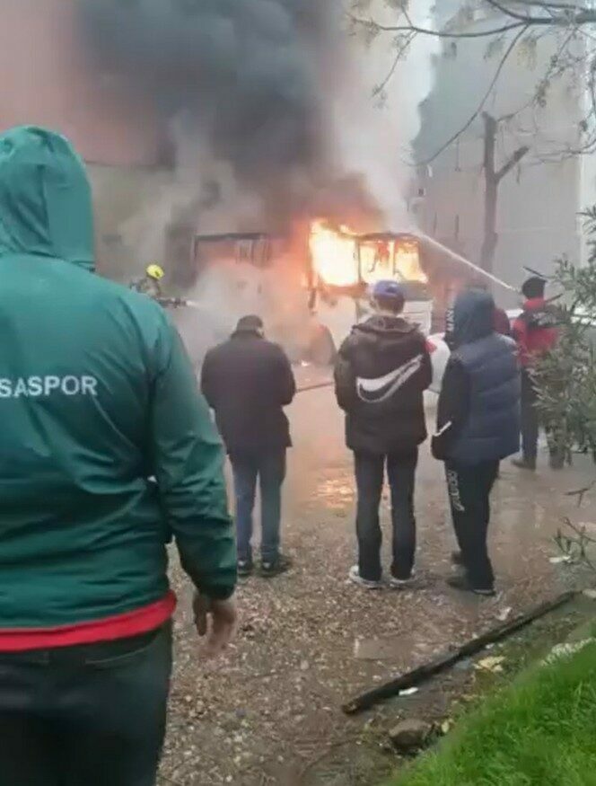 Midibüsün kullanılamaz hale geldiği yangında, otomobil de zarar gördü. O anlar cep telefonuyla görüntülendi.