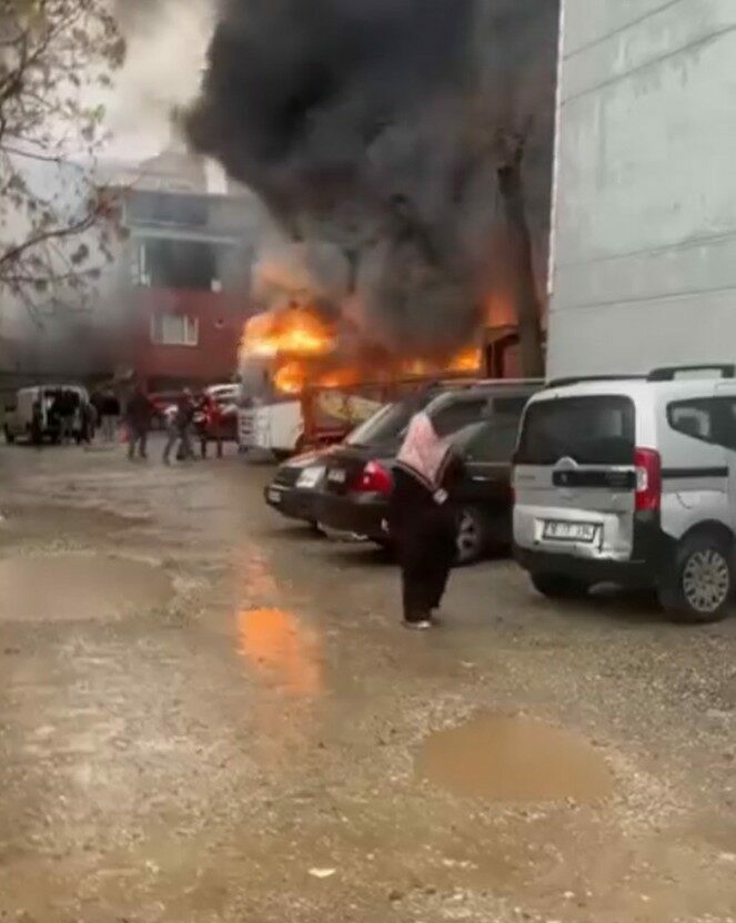 Bir anda tüm midibüsü saran alevler, yanında park halinde olan otomobile de sıçradı.