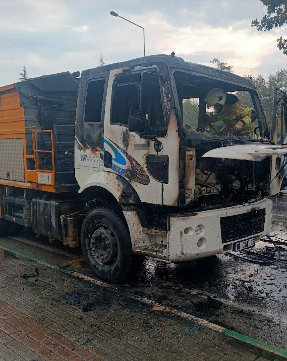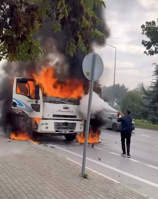 Kısa sürede alevlere dönüşen yangın, tüm aracı sardı. Durumu fark eden sürücü, kamyonu emniyet şeridine çekerek kendini dışarı attı.