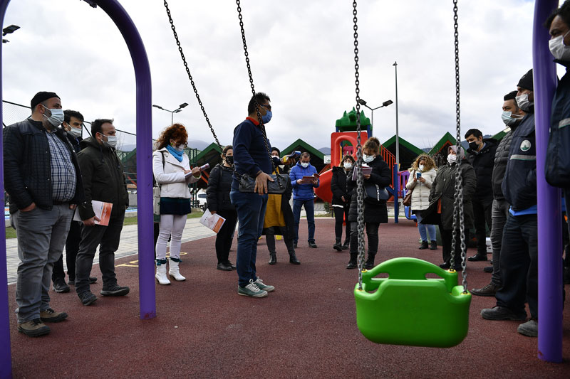 Sahada gerçekleştirilen eğitimin ikinci gününde ise ilçedeki parkları gezen ekipler, parklardaki oyun gruplarının TS EN 1176 nolu standartlara sahip olabilmesi için hangi özellikleri taşımaları noktasında uygulamalı eğitim aldı. Gerçekleştirilen eğitimde salıncaklar arasında olması gereken mesafe açıklığı, salıncak zincirlerinin çocukların parmaklarının sıkışmaması için hangi genişlikte olması gerektiği, kaydırakların yerden ne kadar yüksekte olması ve tahterevallinin eğiminin kaç santimetre olması gerektiği gibi birçok konuda teknik bilgiler verildi.