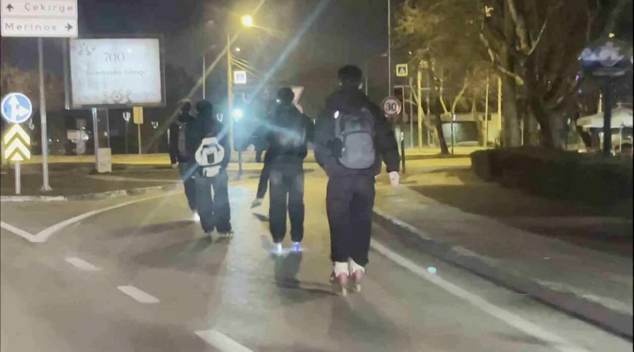 Edinilen bilgiye göre, paten süren gençler araç trafiğinin yoğun olduğu Altıparmak Caddesi’nde uzun süre yol boyunca ilerledi. Gençlerin zaman zaman araçların arasına girdiği ve sürücülere zor anlar yaşattığı görüldü.
