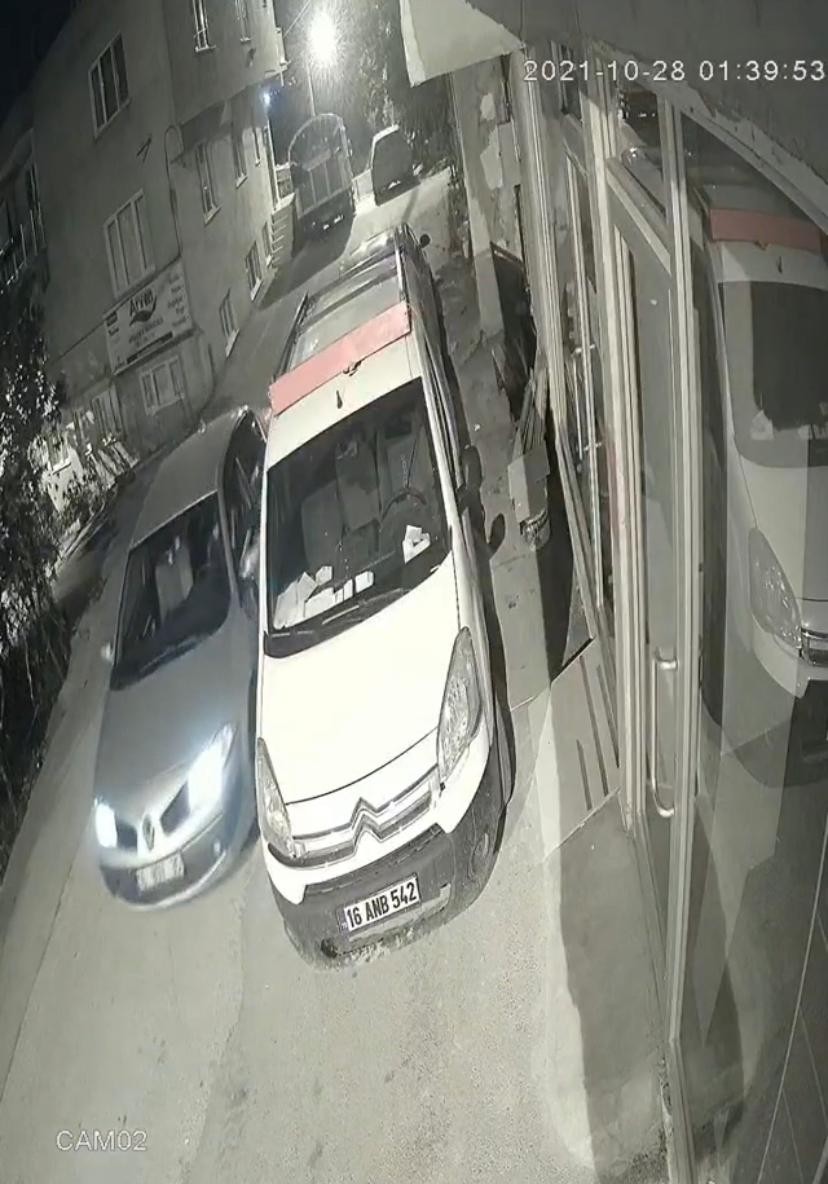 Edinilen bilgiye göre, 2 hırsızlık şüphelisi; gece saatlerinde sokağa kendi otomobilleriyle geldi. Otomobilden inen şüphelilerden biri, hırsızlık yapacağı 16 ANB 542 plakalı hafif ticari aracın kapısını açarak girdi. Diğer şüpheli ise kendi otomobiliyle sokakta geri dönerek arkadaşının hırsızlık amaçlı girdiği hafif ticari araçtan çıkmasını bekledi. Araçtan çıkan hırsızlık şüphelisi arkadaşının gelmesinin ardından sokaktan hızlıca uzaklaşarak kayıplara karıştılar.