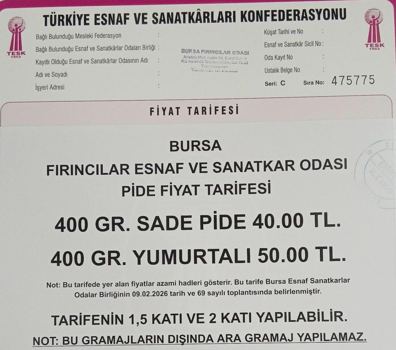 Bursa Fırıncılar Esnaf ve Sanatkârlar Odası tarafından belirlenen yeni tarifeye göre 400 gram sade pide 40 lira, 400 gram yumurtalı pide ise 50 lira oldu.