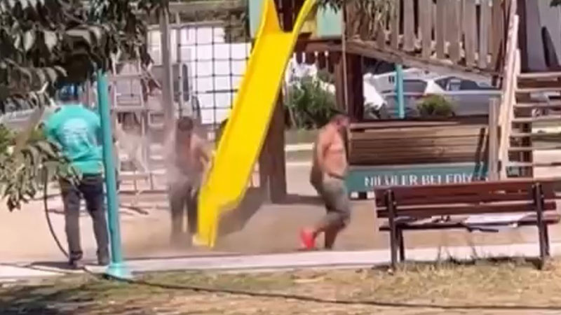 Nilüfer ilçesinde bir parktaki çimleri sulayan belediye temizlik görevlisi, sıcağa rağmen parkta oynayan çocukları görünce, onları serinletmek için elindeki hortumla su sıktı.