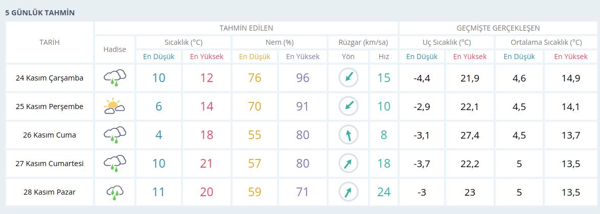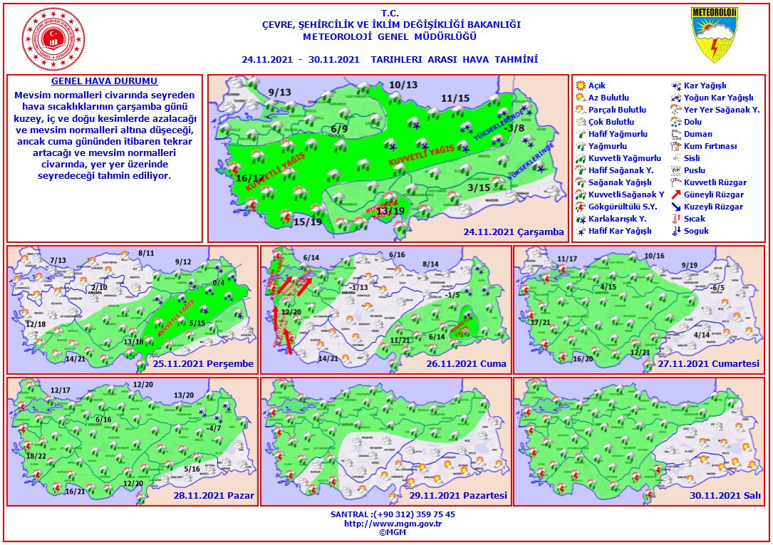 Haftalık Hava Durumu (24 – 30 Kasım 2021) Mevsim normalleri civarında seyreden hava sıcaklıklarının Çarşamba günü kuzey, iç ve doğu kesimlerde azalacağı ve mevsim normalleri altına düşeceği ancak Cuma gününden itibaren tekrar artacağı tahmin ediliyor.