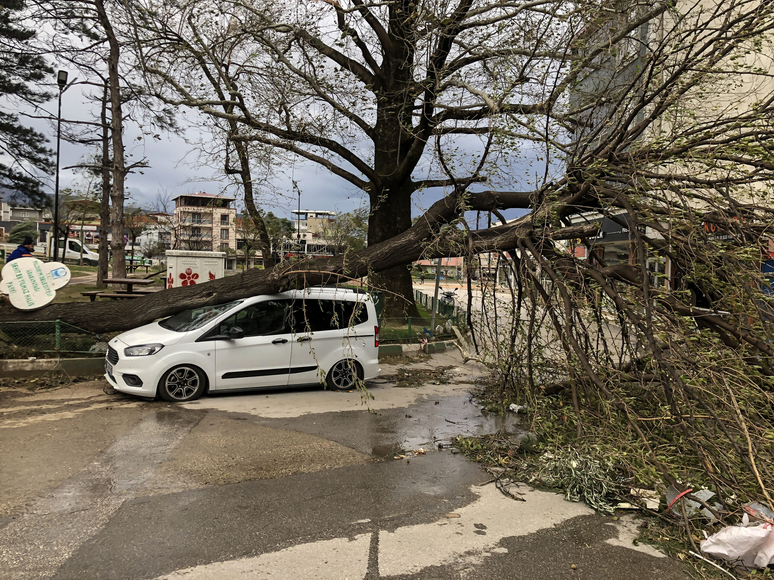 Koza Han’da bulunan tarihi bir çınarın da gövdesinden kırılarak yıkılması sonucu etrafındaki çay bahçelerinde hasar meydana geldi.