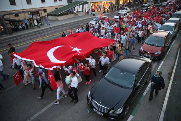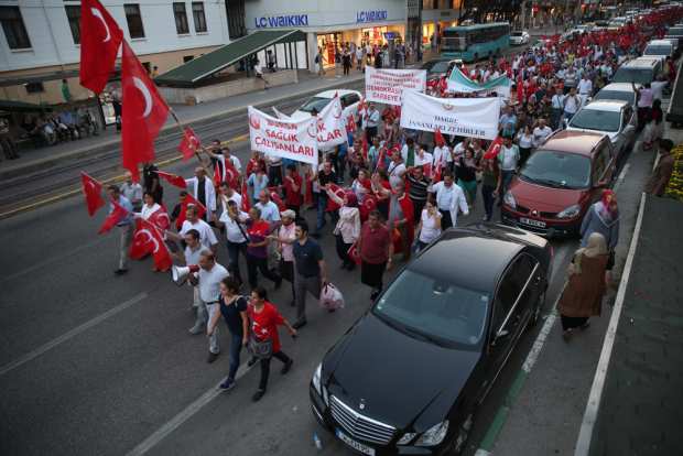 Büyükşehir Belediyesi’nin Atatürk Caddesi’ndeki tarihi binası önünde toplanan, aralarında doktorlar, hemşireler, hastane yöneticileri ve çalışanlarının bulunduğu yaklaşık bin kişi, ellerindeki Türk bayraklarıyla slogan atarak 15 Temmuz Demokrasi Meydanı’na kadar yürüdü.