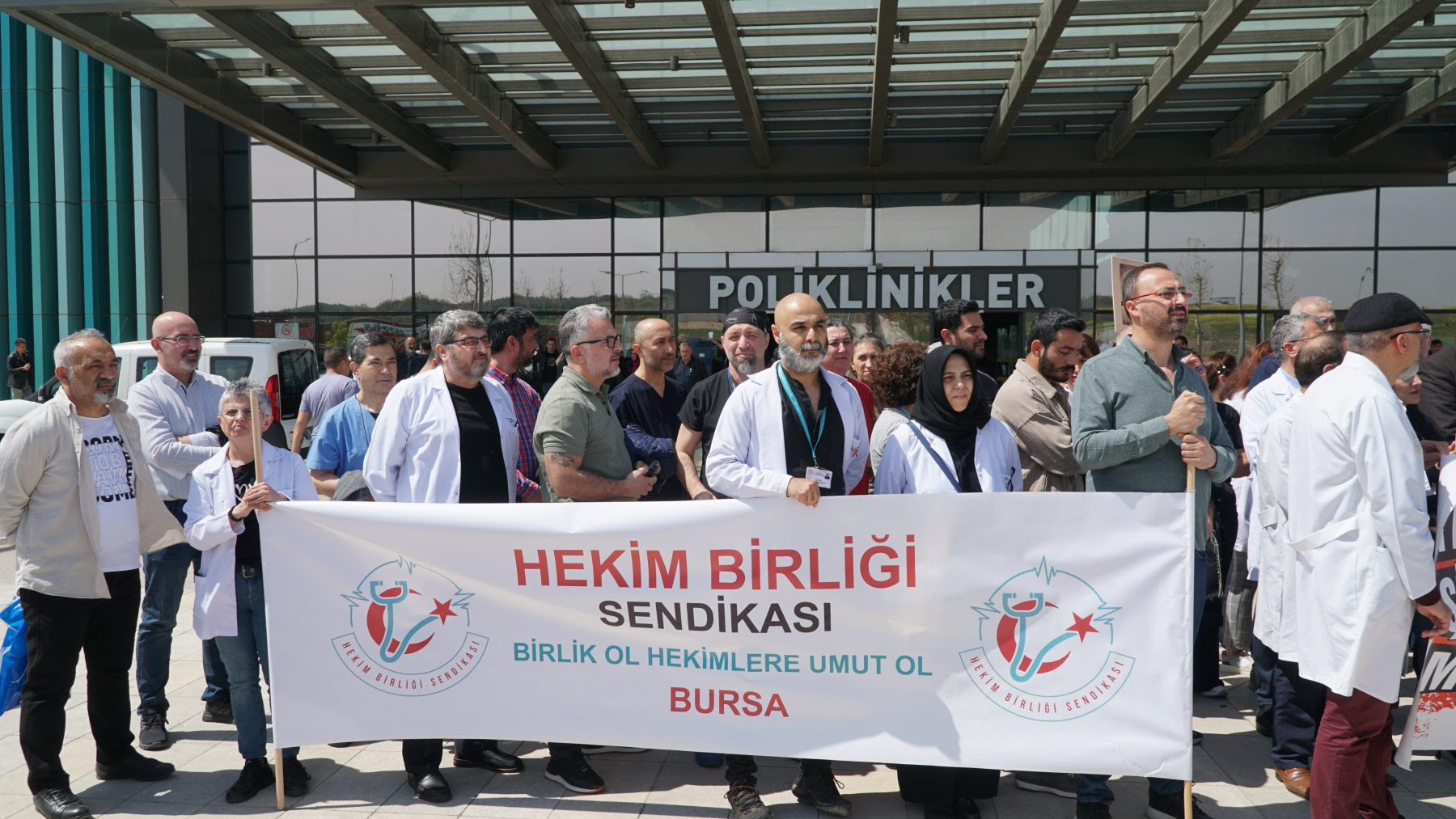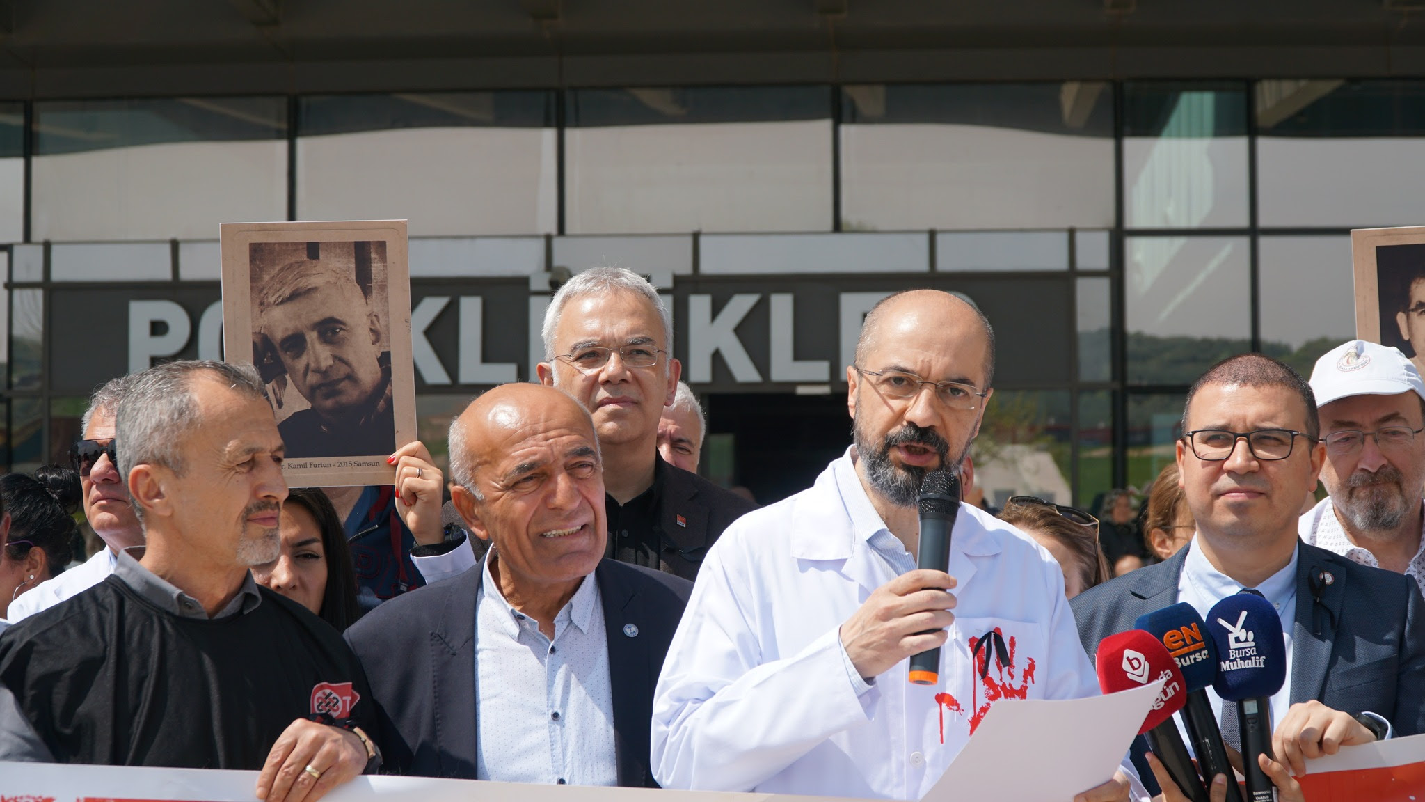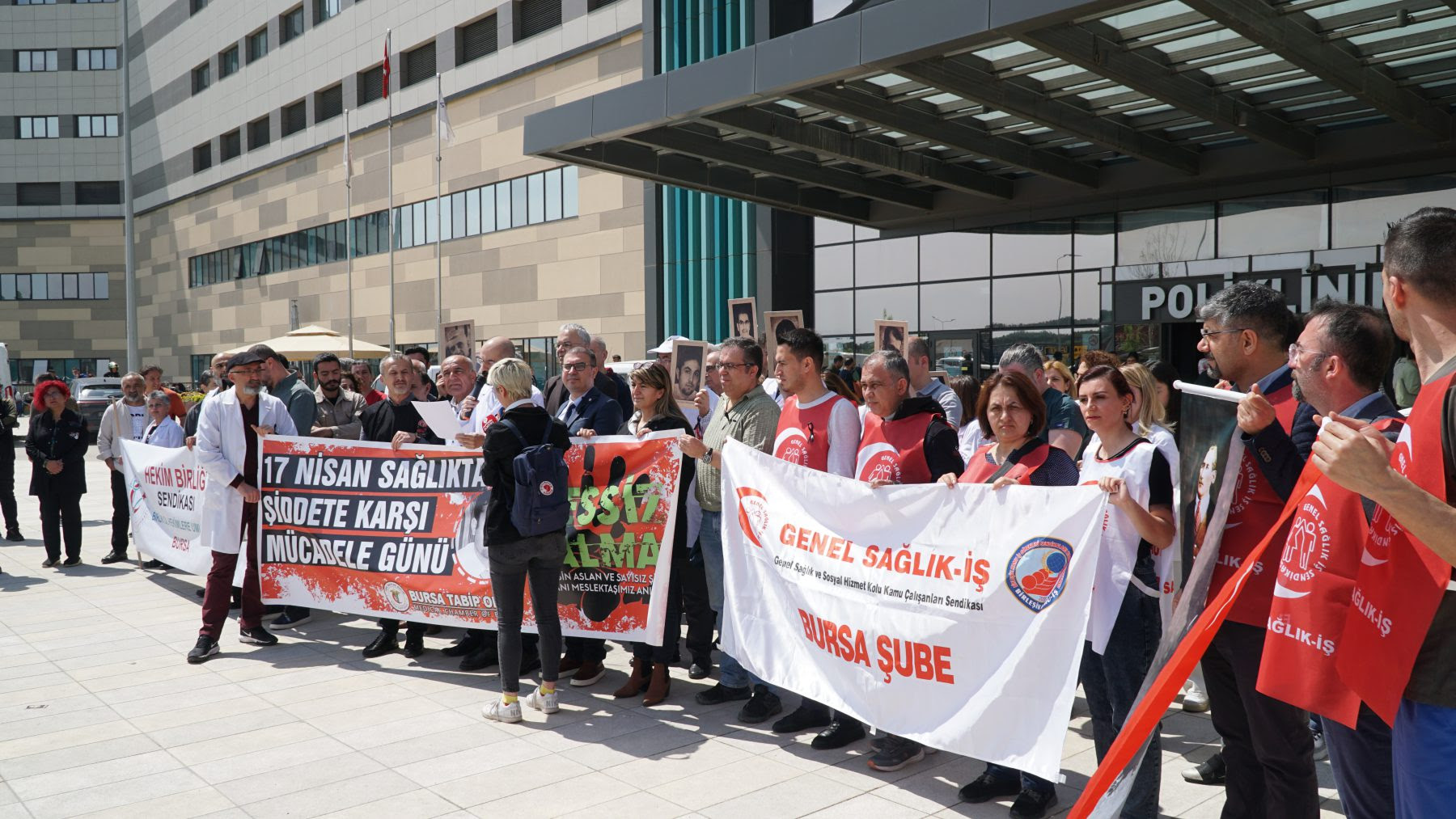 Bursa’da sağlık emekçileri, 17 Nisan Sağlıkta Şiddetle Mücadele Günü’nde, Gaziantep’te görevi başında bir hasta yakını tarafından öldürülen Op. Dr. Ersin Arslan’ı ve şiddet sonucu hayatını kaybeden sağlık emekçilerini andı.