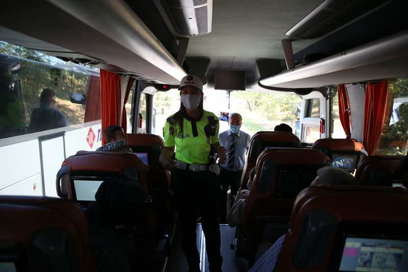 Otobüslere binen trafik ekipleri, yolculara da emniyet kemeri takmaları ve ihlal gerçekleştiren otobüs şoförlerini ihbar etmeleri konusunda uyarılarda bulunuyor.