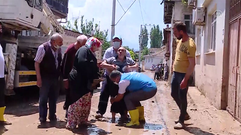 Çamur birikintileri arasında iş makineleri ve küreklerle çalışan ekipler, yürümekte güçlük çeken engelli kişiyi gördü.