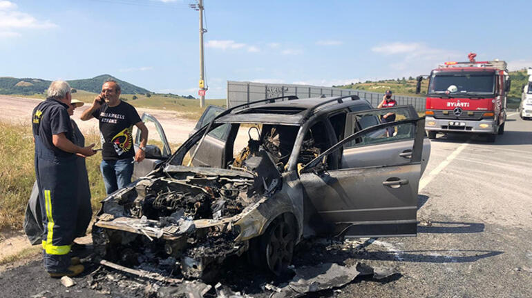 Sürücüsünün ana yolda emniyet şeridine çekerek eşi ile birlikte indiği araç birden alev aldı. Yoldan geçen araçlardaki yangın tüpleri ile müdahale edilen otomobile olay yerine çağrılan itfaiye ekipleri de müdahale ederek, araçtaki yangını söndürdü. Yanan otomobil kullanılamaz hale gelirken, jandarma ve itfaiye ekipleri olayla ilgili soruşturma başlattı.