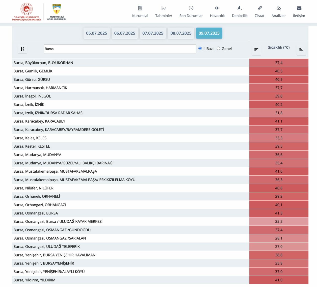 İŞTE BURSA VE İLÇELERİNDE 9 TEMMUZ ÇARŞAMBA GÜNÜ HİSSEDİLEN DERECELER ŞÖYLE;