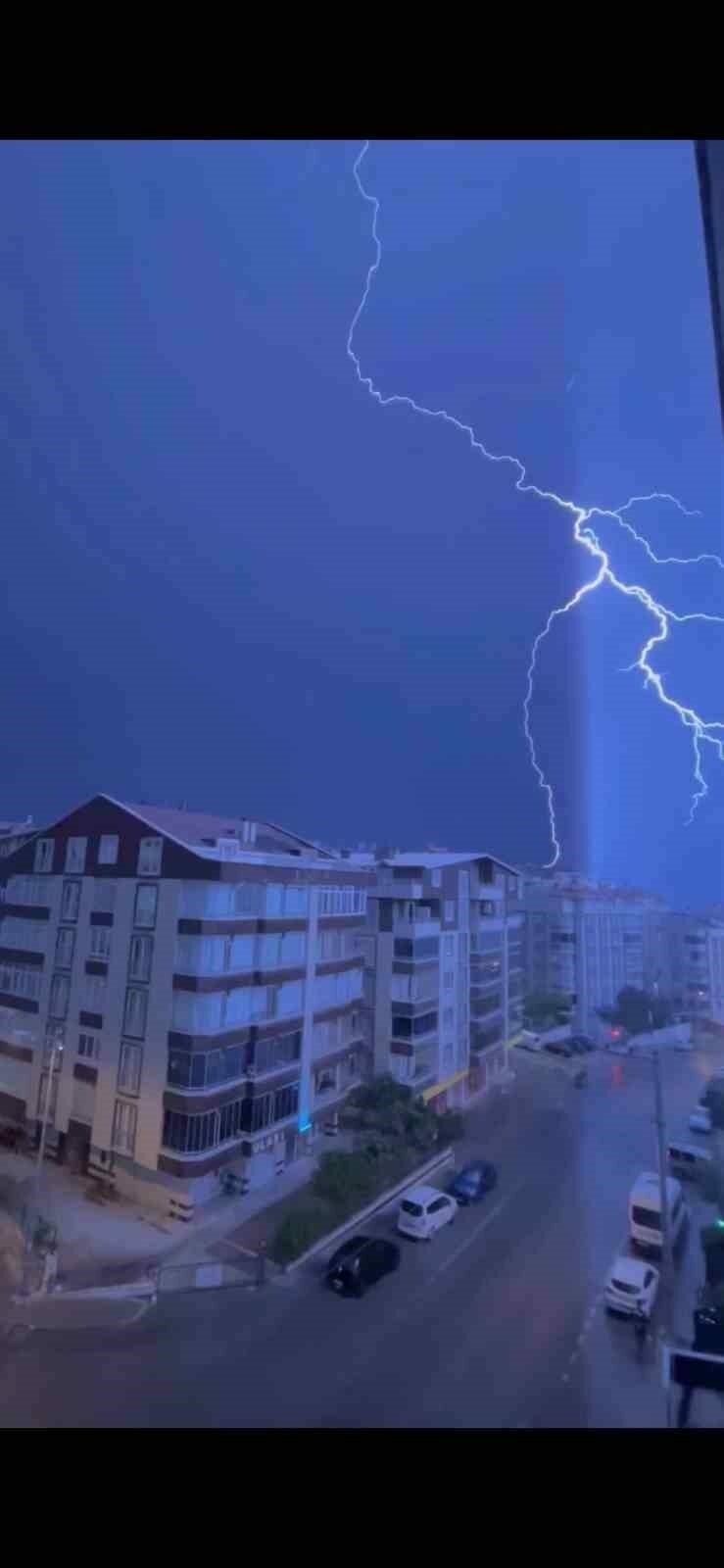 Gökyüzünden neredeyse yere kadar uzanan şimşek gecenin karanlığını aydınlığa çevirdi