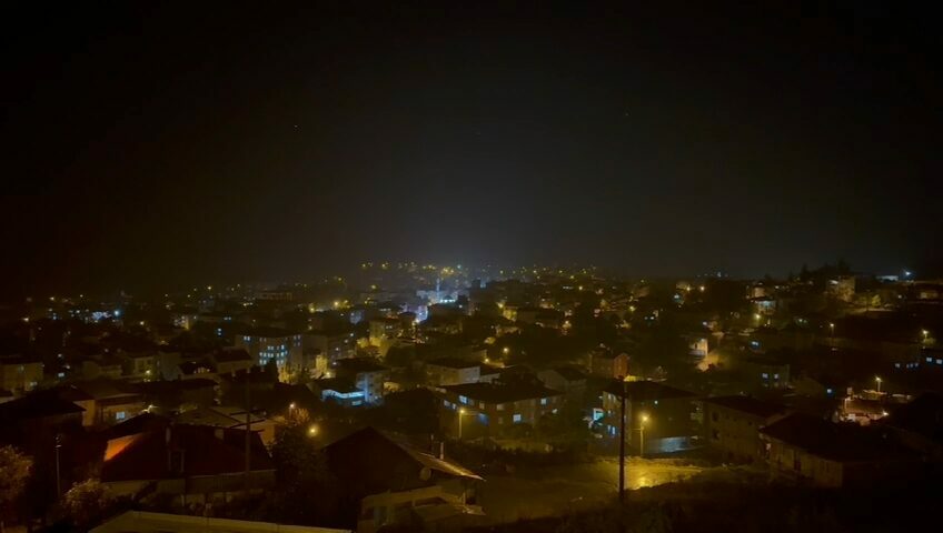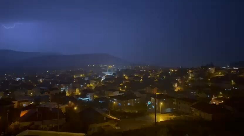 Bursa’nın Orhaneli ilçesinde akşam saatlerinde etkili olan sağanak yağışla birlikte gökyüzünü aydınlatan şimşekler, geceyi gündüze çevirdi.