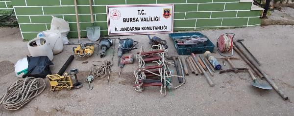 Ayrıca şüphelilerin yanlarında bulunan 20 metre uzunluğunda seyyar merdiven, 15 metre uzunluğunda makaralı halat, 20 metre uzunluğunda seyyar kablo, 2 adet kazma, 2 adet kürek, 10 metre uzunluğunda seyyar lamba, 2 adet hilti makinası, elmaslı delme makinası, delici elmas boru, jeneratör ve kazı için kullanılan muhtelif demir malzemelere el konuldu.