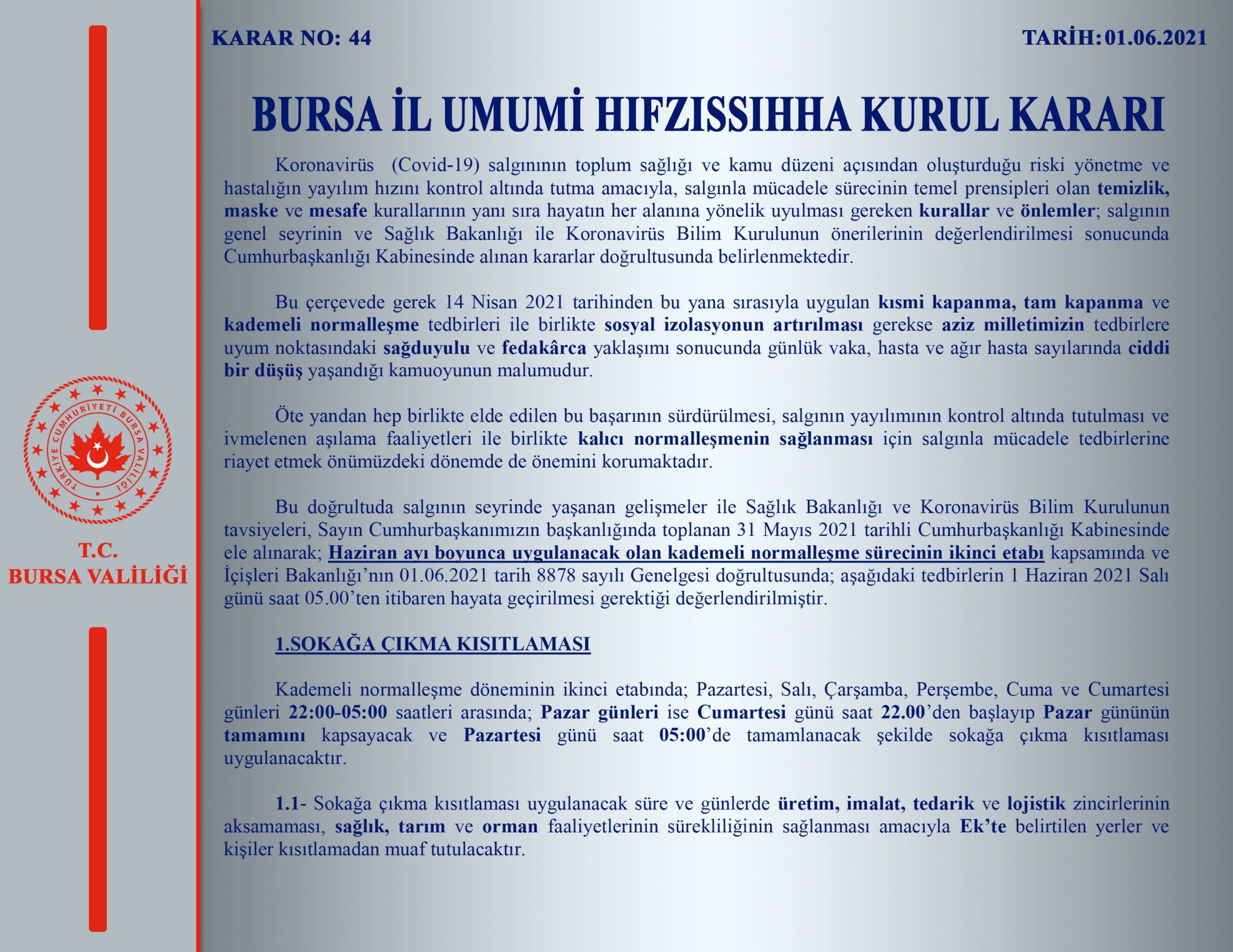 Kabine toplantısı sonrasında yeni kararlar açıklandı.Bursa’da sokağa çıkma yasağının saatleri değişti. Peki hafta içi ve hafta sonu sokağa çıkma yasağı saatleri neler? İşte sokağa çıkma yasağı ile ilgili son dakika gelişmeleri…