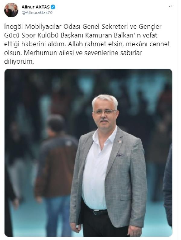Bursa Büyükşehir Belediye Başkanı Alinur Aktaş, sosyal medya hesabından yaptığı paylaşımda, “İnegöl Mobilyacılar Odası Genel Sekreteri ve Gençler Gücü Spor Kulübü Başkanı Kamuran Balkan’ın vefat ettiği haberini aldım. Allah rahmet eylesin, mekânı cennet olsun. Merhumun ailesi ve sevenlerine sabırlar diliyorum” ifadelerine yer verdi.