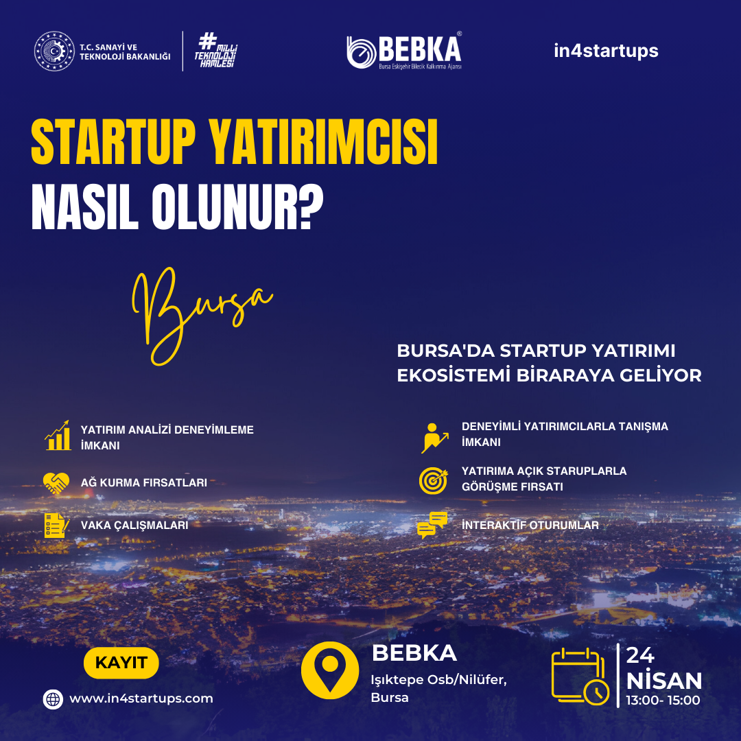 Sanayi ve Teknoloji Bakanlığı koordinasyonunda faaliyetlerini sürdüren BEBKA ve in4startups, girişimcilik ekosisteminin güçlenmesine katkıda bulunacak bu önemli etkinlik için tüm ilgili kişi ve kurumları Bursa’ya davet ediyor.