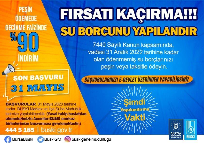 Yapılandırmadan faydalanmak isteyen vatandaşların son başvuru tarihi olan 31 Mayıs 2023 tarihine kadar BUSKİ merkez ve ilçe şube müdürlüklerine, yasal takibe alınmış abonelerin ise sadece Acemler – BUSKİ merkez birimlerine başvuruda bulunması gerekiyor.