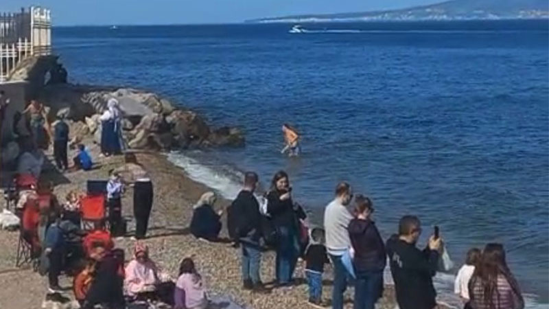 Ilık havayı değerlendirmek isteyen bazı vatandaşlar Mudanya sahilinde denize girerek Şubat ayında sıra dışı görüntülere imza attı.