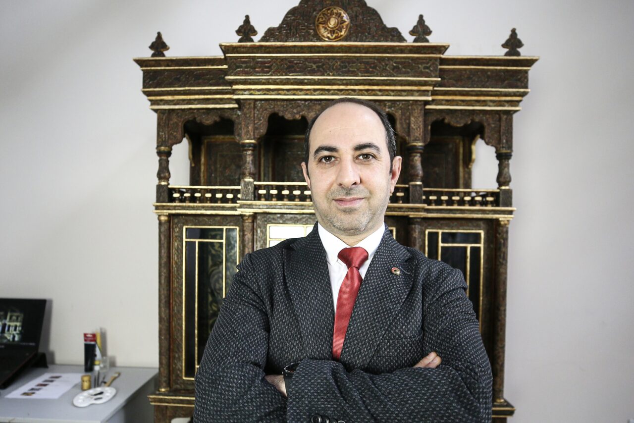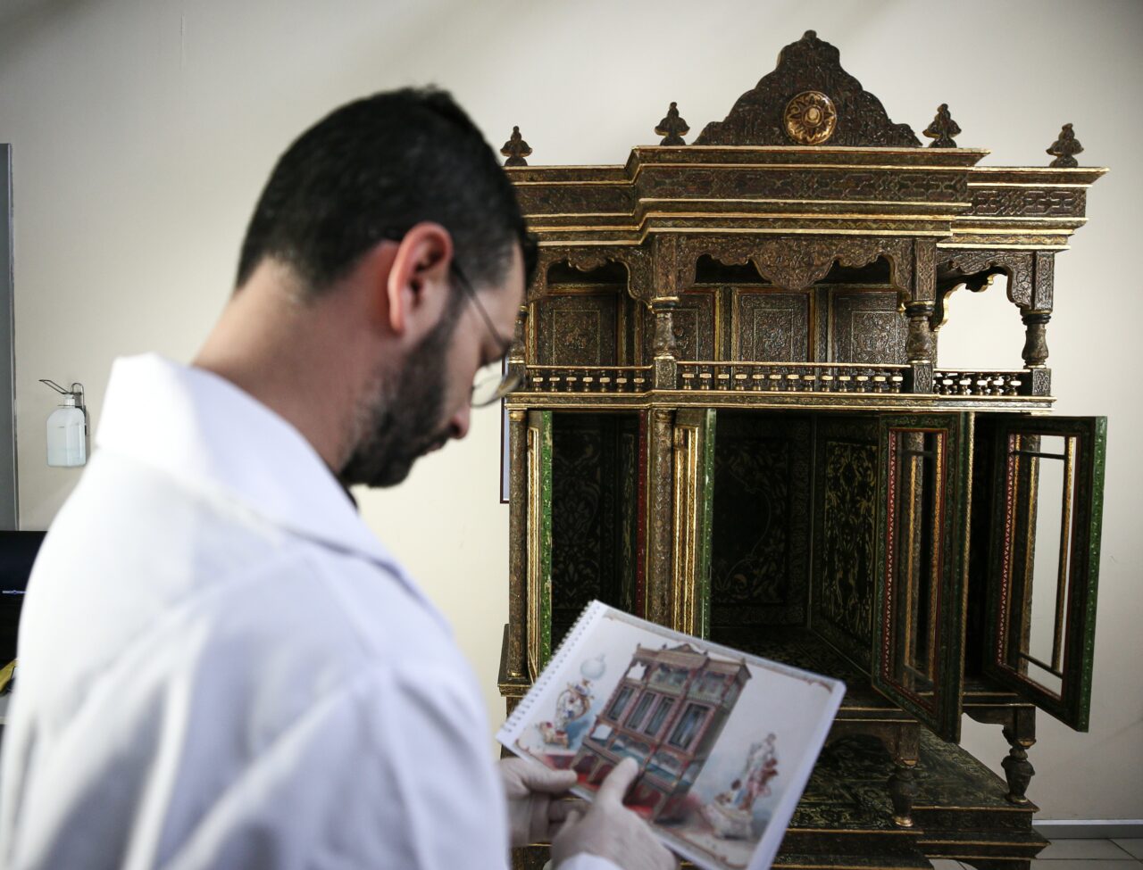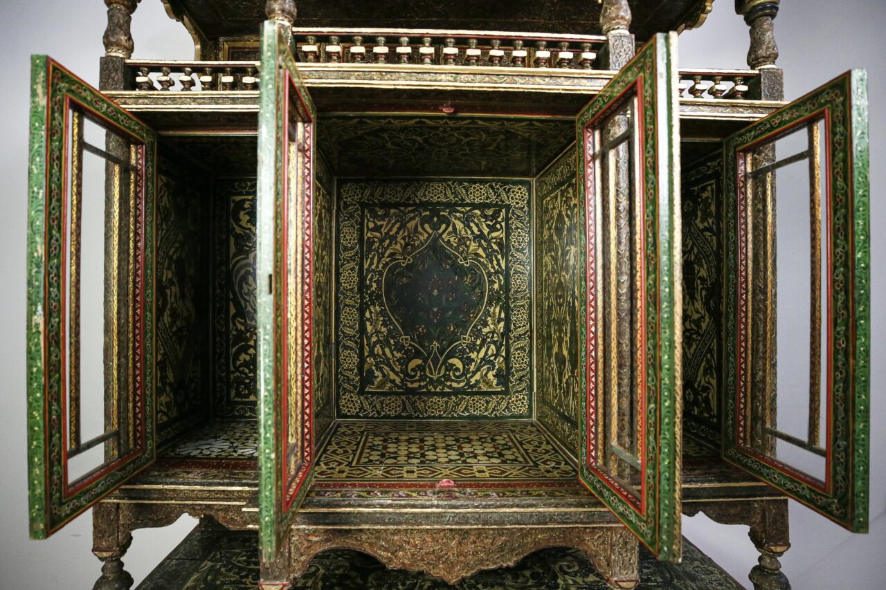Bilmiş, ahşap dolabın yaklaşık 2 metre boyutunda olduğunu, sergi kataloğunda “Tarzı Arap üzere iki metre irtifaaında mamul edilmiş bir süslü camlı dolap” notuyla geçtiğini anlattı.