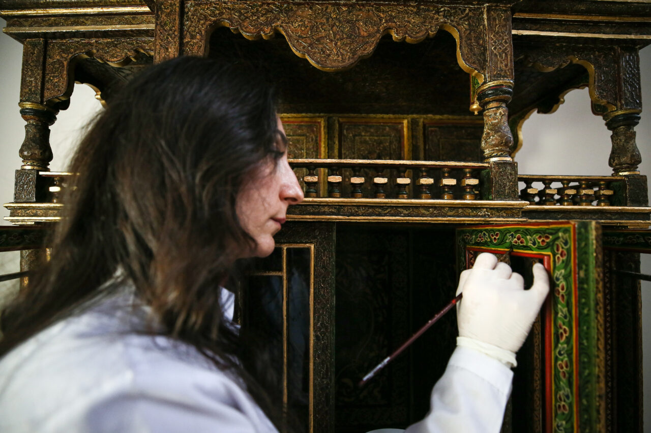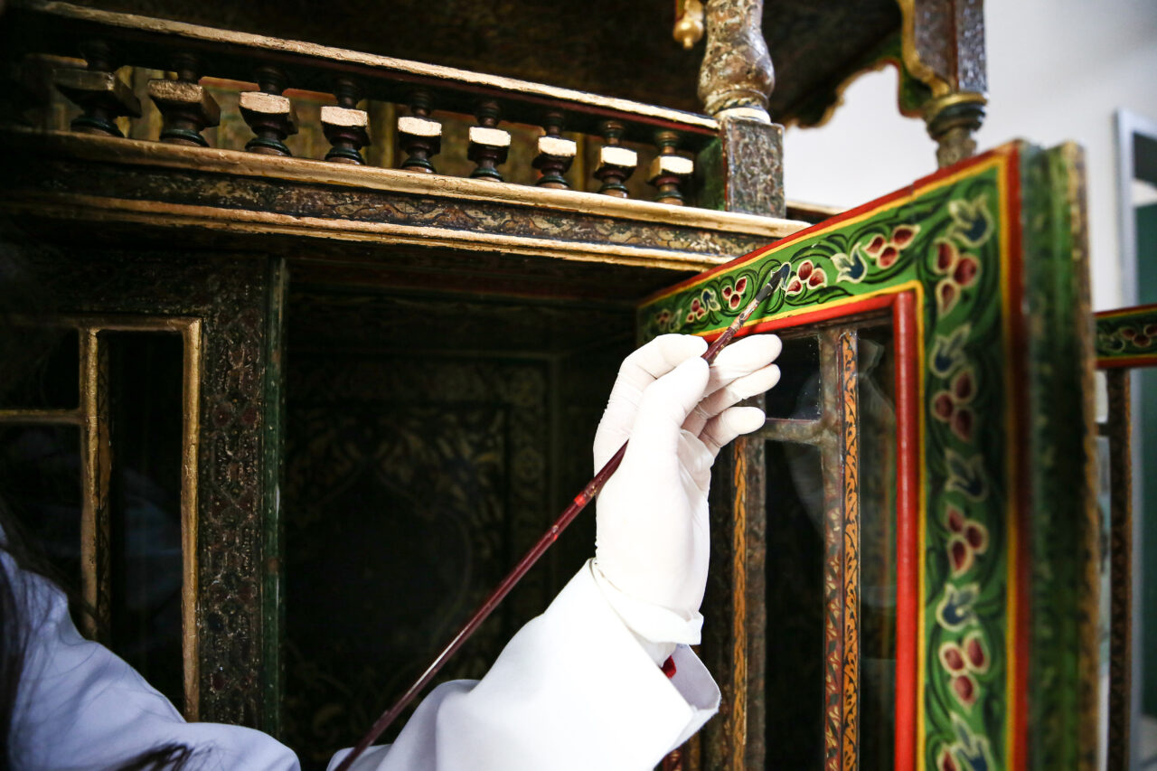 Tezhip inceliğinde işçilikle imal edilen, neredeyse tüm yüzeyleri yoğun bezemelerle kaplı olan varak işlemeli dolap, peyderpey yaklaşık 6 yıl süren restorasyon ve konservasyon çalışmalarının tamamlanmasının ardından ilk günkü haline dönüştürüldü.
