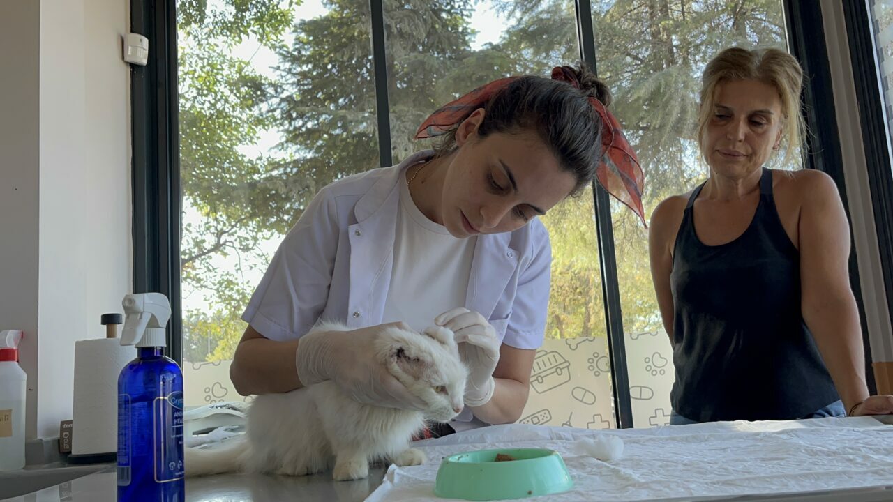Sütlaç’ın kliniğe ilk gelişini anlatan Çakır, “İlk geldiğinde oldukça enfekteydi. Ağrısı vardı, insanlardan çok fazla korkuyordu ama son 2 gündür ağrıları ve kulaklarındaki enfeksiyon azalmaya başlayınca insanlara daha yanaşmaya başladı. Şu anda beslenmesi iyi, sağlık durumu hızlıca iyiye gidiyor. İnşallah en kısa zamanda dikişlerinden de kurtulabilirsek hızlıca sağlığına kavuşacaktır ama kulaklarının kesilmesinden dolayı artık duymuyor” ifadelerini kullandı.