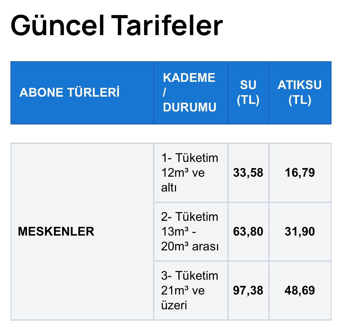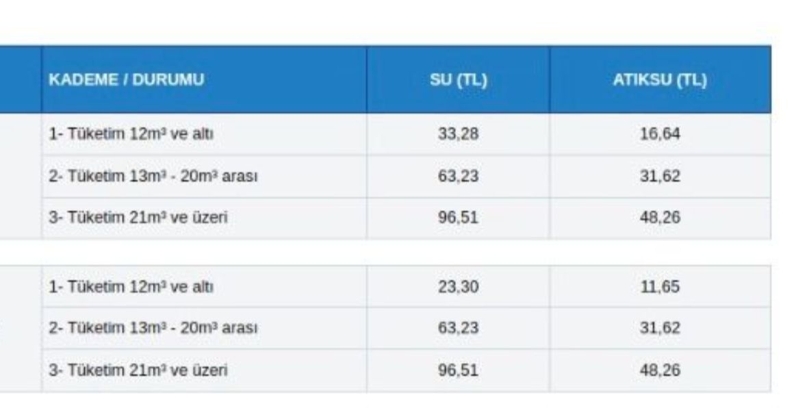 Yapılan düzenlemeyle birlikte yıl başında 33 lira 28 kuruş olarak belirlenen 1. kademe su birim fiyatı (12 metreküp ve altı) 33,58 liraya yükseltildi. Aynı kademede 16,64 lira olan atıksu bedeli ise 16,79 kuruş oldu. 2. Kademe su birim fiyatı (13-21 metreküp) 63,23 liradan 63,80 liraya, 3. Kademe su birim fiyatı (21 metreküp ve üstü) ise 96,51 liradan 97,38 liraya yükseldi.