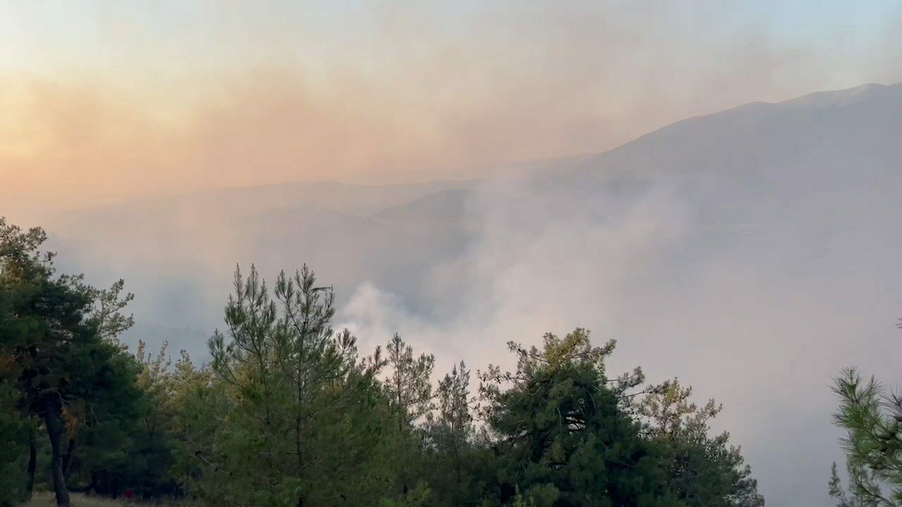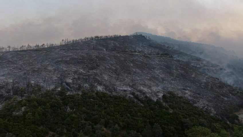 Lokal olarak süren alevlere müdahale uçak ve helikopter desteğiyle sürerken, yangın bölgesi dronla havadan görüntülendi.
