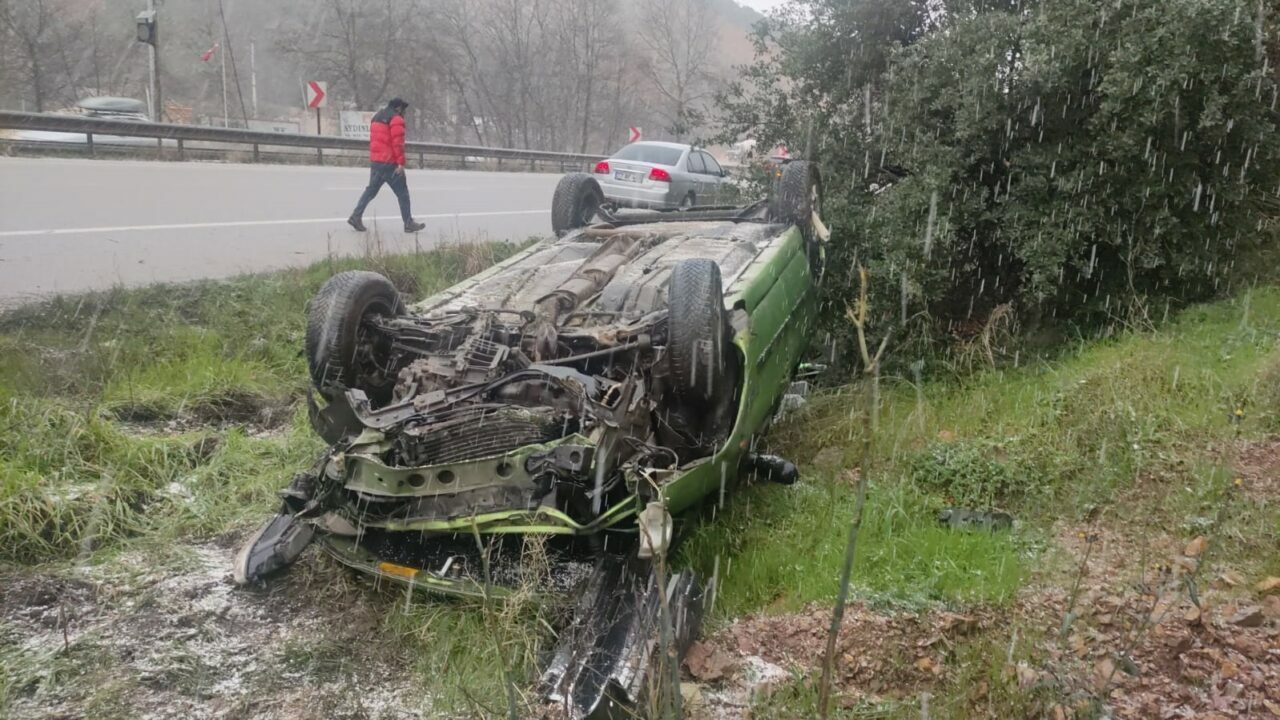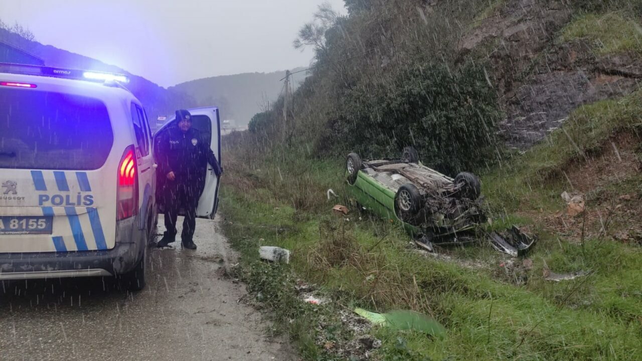 Yağış nedeniyle kayganlaşan yolda Berkcan Doruk’un direksiyon kontrolünü yitirdiği 16 HJ 166 plakalı otomobil takla attı.
