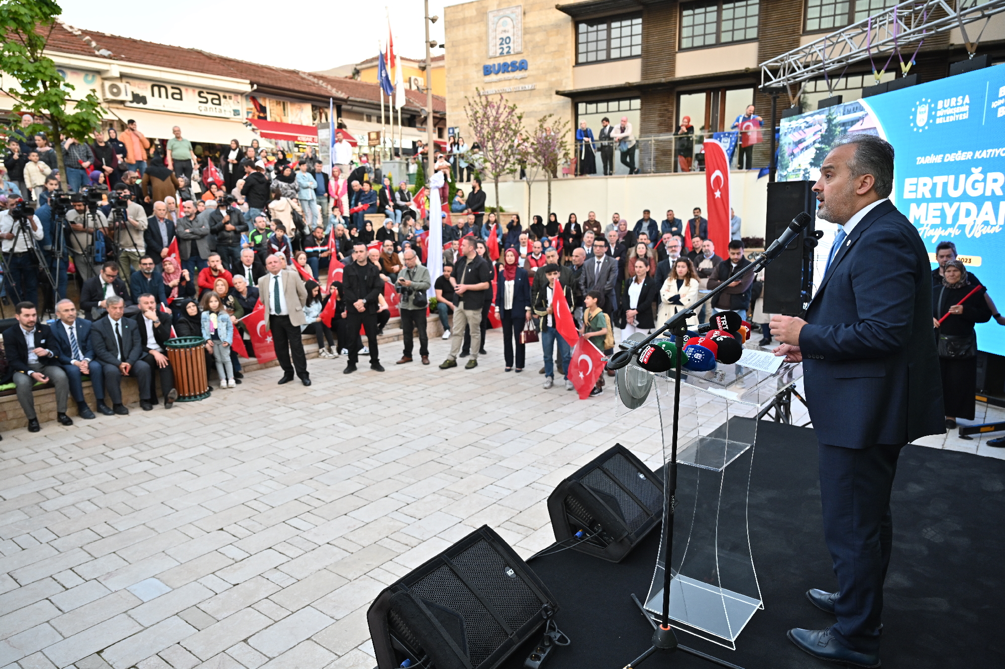 Bursa Büyükşehir Belediye Başkanı Alinur Aktaş konuşmasına, Tarihi Çarşı ve Hanlar Bölgesi’nin çehresinin değiştirilmesine yönelik bugüne kadar yapılan çalışmalarda emeği olan geçmiş tüm belediye başkanlarına teşekkür ederek başladı. Tarihi bölge ile ilgili olarak 2019 yılı sonu itibariyle bir yola çıktıklarını hatırlatan Başkan Aktaş, “Bu özel mekanın ortaya çıkarılması ile alakalı bir hedefimiz vardı. Çok maliyetli, hukuki anlamda çok sıkıntılı bir iş olduğunu biliyorduk. Projeyi Cumhurbaşkanımıza, Murat Kurum bakanımıza açtım ve hamdolsun bugün çok ciddi mesafeler aldık. Algıyla, yalanla bizi engellemeye çalıştılar. ‘Bu bir rant projesi’ dediler. Ama görüyorsunuz 5 metrekare dahi bir satış yeri yok. Burada sadece ve sadece meydan var ve beraberinde ihya etmeye çalıştığımız bir cami türbe ve hazineler var. Otopark bölgenin en büyük ihtiyacıydı, onu da tamamlıyoruz. Kamulaştırma maliyeti dahil 500 milyondan daha fazla para harcadığımız bir proje oldu. Hanlar Bölgesi’nin 7/24 canlı bir yer olmasını istiyoruz. Bu çalışmalar kapsamında Ertuğrulbey Meydanı’nında tarihi yapıyı ortaya çıkarmış olduk” diye konuştu.