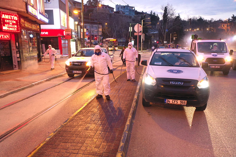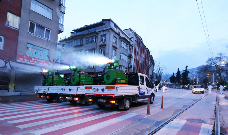 Çin’de ortaya çıkan, tüm dünyayı etkisi altına alan ve Türkiye’de de ölümlere yol açan ‘Covid 19’ salgınına karşı ilk günden itibaren yoğun bir çalışma başlatan Bursa Büyükşehir Belediyesi özellikle dezenfeksiyon çalışmalarını kesintisiz sürdürüyor. Sağlık İşleri Dairesi Başkanlığı Veteriner Hizmetleri Şube Müdürlüğü tarafından yürütülen, 32 araç, 82 ekipman ve 69 personelle yapılan çalışmalarda, yerli ve yabancı turistlerin uğrak yeri olan sultan külliyeleri, tarihi çarşı ve hanlar, türbeler selatin camileri, kamu kurumları, otobüs durakları, toplu taşıma araçları, taksi ve dolmuşlar ve alt geçitler periyodik olarak dezenfekte ediliyor.