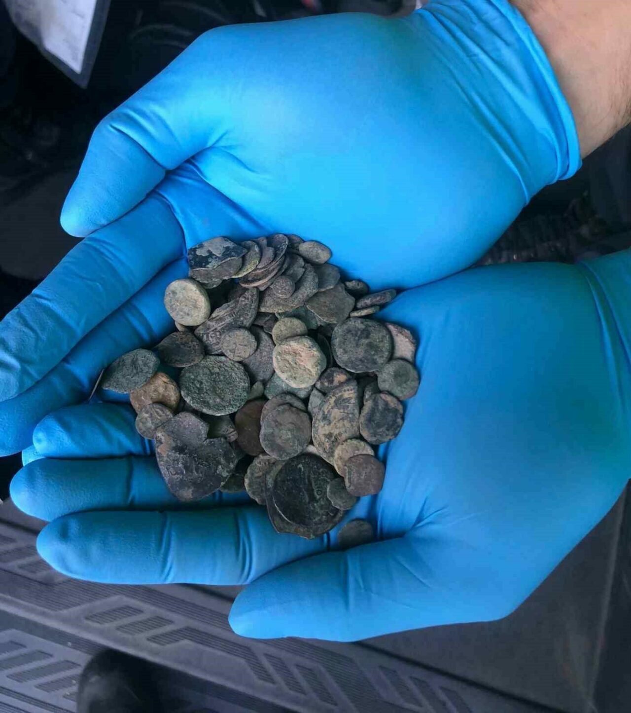 Araçta yapılan aramada, çeşitli dönemlere ait tarihi eser niteliği taşıyan 222 sikke ile 41 obje ele geçirildi. Araçta bulunan şüpheliler U.S, M.E.K. ve M.İ.K. gözaltına alındı.