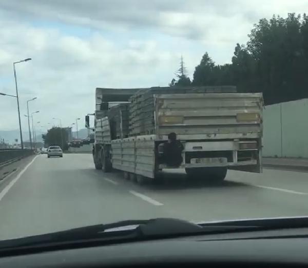 Kentte seyir halindeki kamyonun kasasına elleriyle tutunan gencin tehlikeli yolculuğu, trafikteki başka sürücü tarafından cep telefonu kamerasıyla görüntülendi.