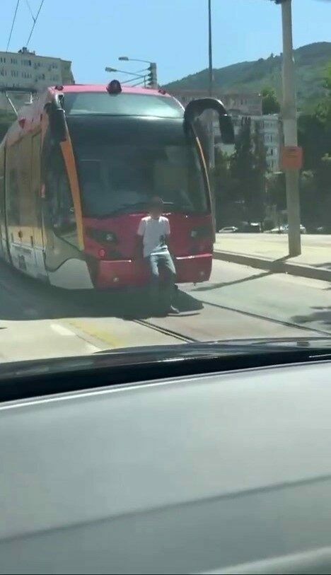 Bir genç, kendi canını tehlikeye atarak seyir halindeki tramvayın arkasına tutundu.