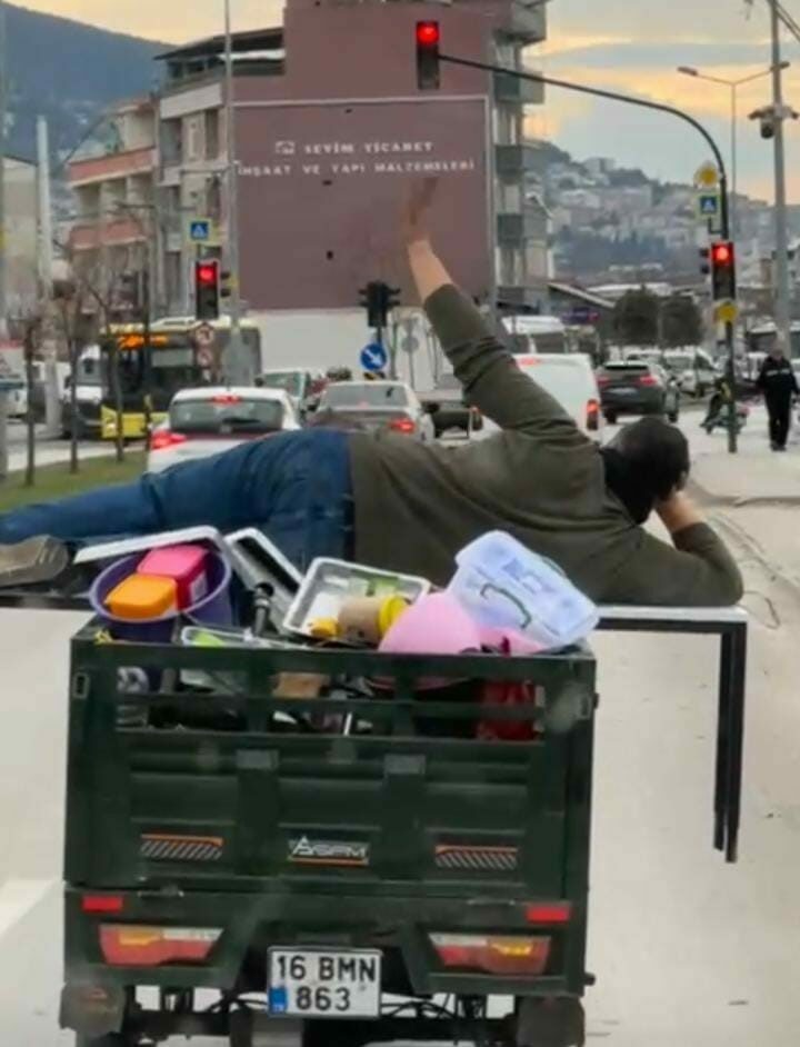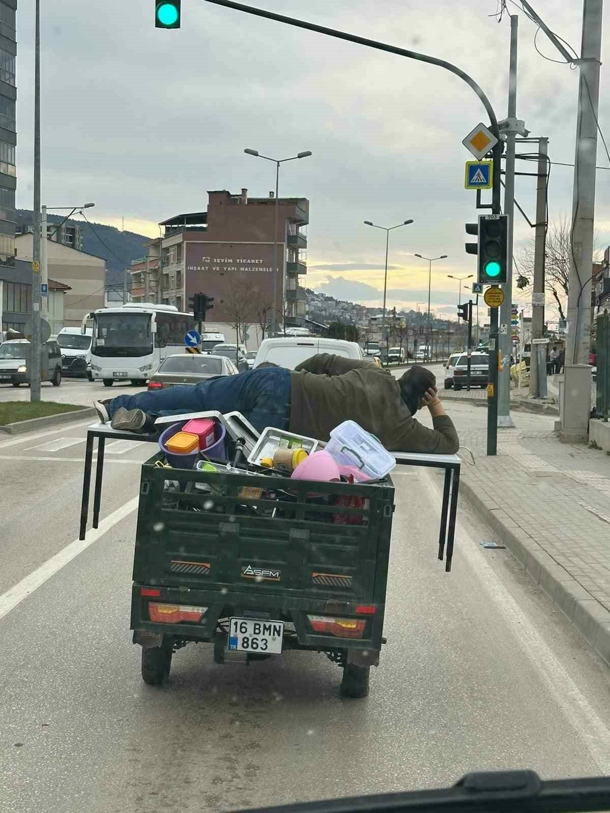 16 BMN 863 plakalı kasalı motosikletin kasa kısmına yerleştirilen masanın üzerine uzanarak yolculuk yapan bir adam, trafikteki diğer sürücülerin dikkatini çekti. Yattığı yerden çevredeki araçlara el sallayan şahıs, görenleri hem güldürdü hem de düşündürdü.