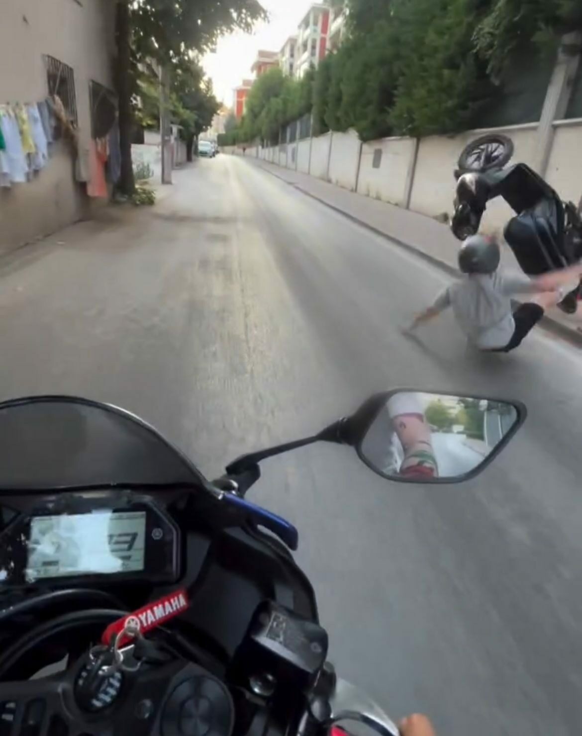 Motosiklet de havada takla atıp düşerken, o anlar başka bir motosiklet sürücüsünün kask kamerasına yansıdı. (DHA)