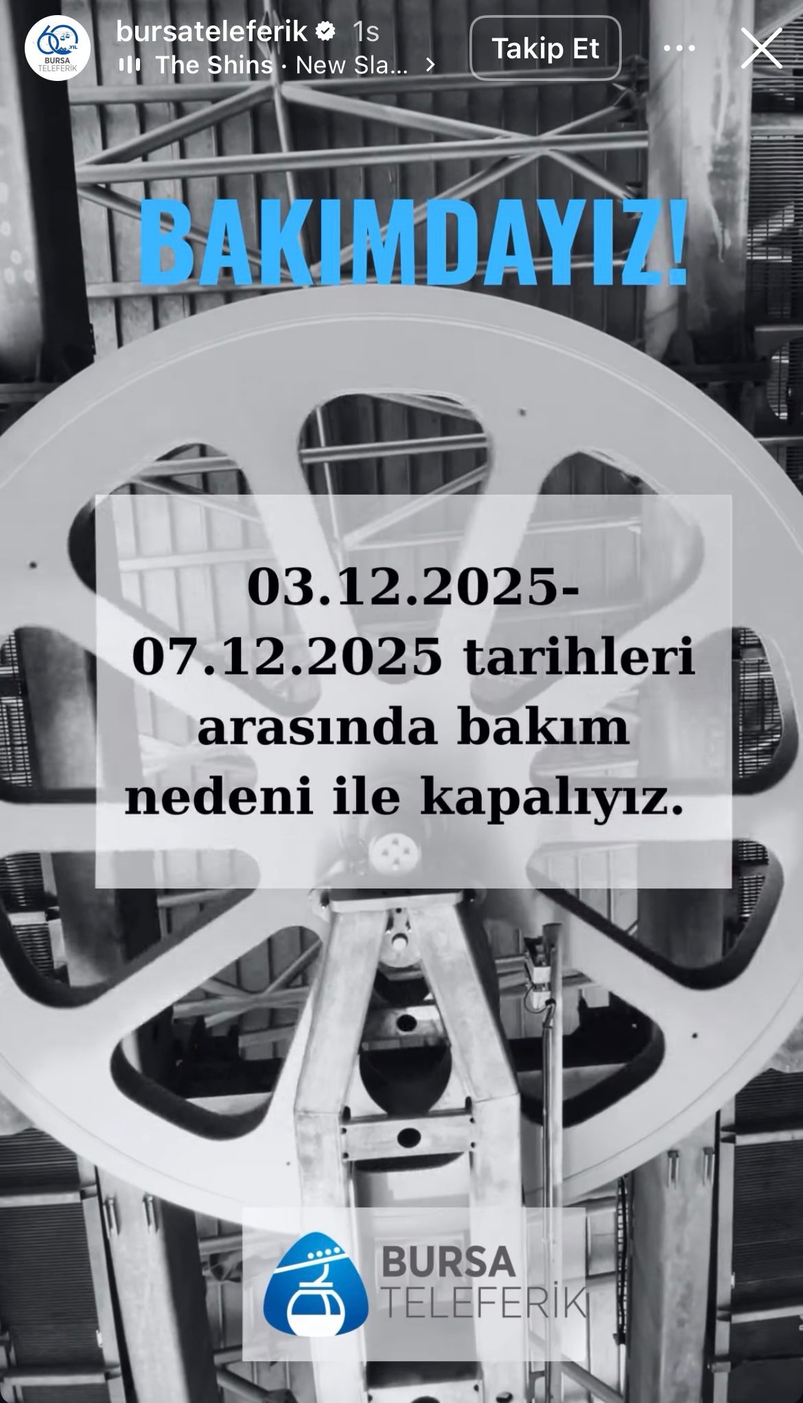 Bursa Teleferik’ten yapılan açıklamaya göre, hatta planlanan periyodik bakım çalışmaları nedeniyle seferler 3 Aralık ile 7 Aralık tarihleri arasında durduruldu. Bu süre boyunca teleferik hattı yolcu kabul etmeyecek.