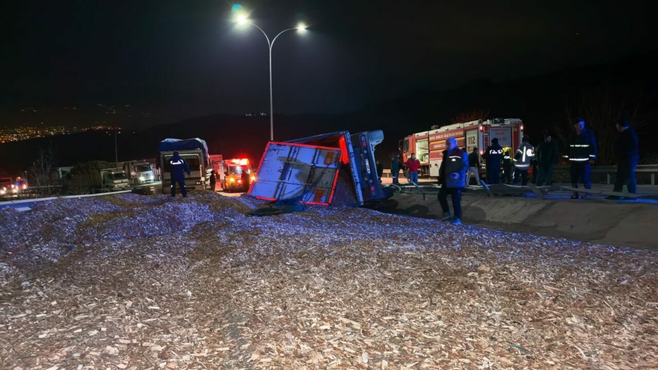 Mobilya Organize Sanayi Bölgesi’nde faaliyet gösteren bir orman ürünleri fabrikasından yüklediği talaşı ilçe merkezine taşıyan Emrah Aydın (29) yönetimindeki 16 AUC 722 plakalı TIR, yokuş aşağı virajlı yolda sürücüsünün kontrolünden çıktı.