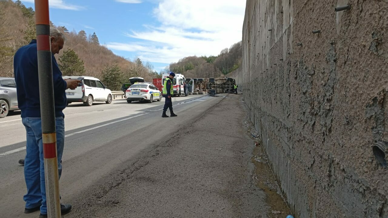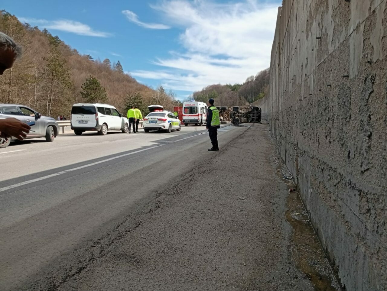 Sürüklenen TIR, karşı yöne geçti. Kazada TIR şoförü K.A. yaralanırken, karayolunun bir şeridi de trafiğe kapandı.