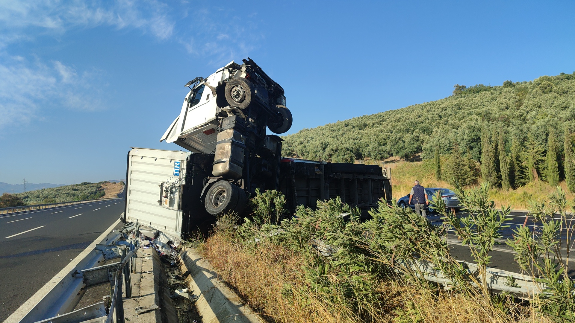 İstanbul-İzmir Otoyolu’nda Bursa yönüne seyreden Ali Güler (28) yönetimindeki 41 AIY 410 plakalı TIR, Gedelek Viyadüğü yakınında yolun sağındaki bariyere çarptı. Sürüklenerek devrilen ve kupası havaya kalkan TIR’ın dorsesindeki yaklaşık 25 ton enerji içeceği etrafa saçıldı.